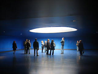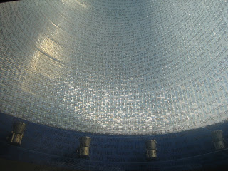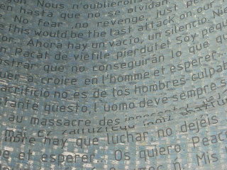 Pero lo mas impresionante es la parte interior, donde accedemos a una sala azul, que deja entrar la luz del cilindro por su parte central y en la que podemos ver mensajes a las víctimas en infinidad de idiomas.