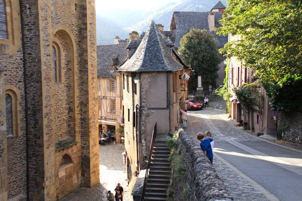 Si como nosotros tenéis pensado visitar Conques con niños, hay que tener en cuenta que no es el pueblo mas accesible de Francia, las calles son en muchos casos adoquinadas y hay escaleras y cuestas, así que si vuestro peque va en carrito no será un trayecto cómodo.